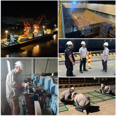 安全保障萬無一失。公司嚴(yán)格落實(shí)安全生產(chǎn)主體責(zé)任,實(shí)施全流程安全管控。在作業(yè)籌備階段,開展專項(xiàng)培訓(xùn),全面排查潛在安全隱患,精準(zhǔn)識別出42個風(fēng)險點(diǎn)并逐一制定防控措施,確保隱患整改到位。作業(yè)期間,安全管理人員晝夜不停、連續(xù)奮戰(zhàn)五天,始終堅守在作業(yè)現(xiàn)場,實(shí)時監(jiān)控作業(yè)動態(tài)。面對港區(qū)交通壓力,安保人員頂著烈日在各個路口疏導(dǎo)交通,重新規(guī)劃運(yùn)輸路線,增設(shè)臨時交通標(biāo)識,在車流如織的港區(qū)開辟出一條安全通道,為外輪作業(yè)提供全方位安全保障。